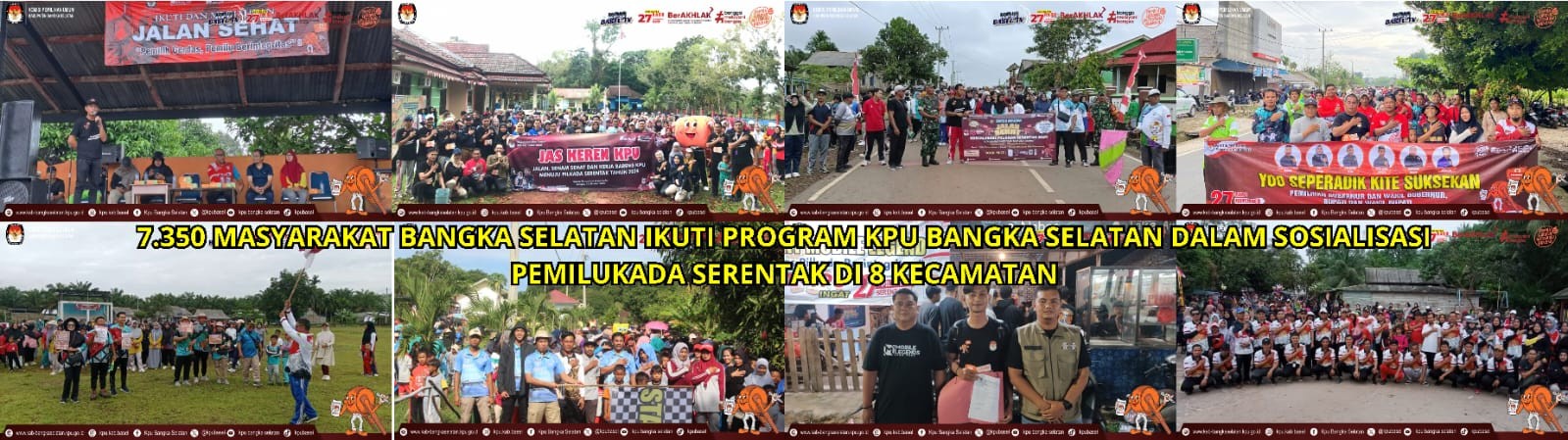 Kegiatan ini dilaksanakan oleh KPU Kabupaten Bangka Selatan bersama PPK se-Kabupaten Bangka Selatan dan diikuti masyarakat Kabupaten Bangka Selatan dimasing-masing kecamatan yang diperkirakan berjumlah 7.350 orang dari total tiap-tiap kecamatan. Dalam selenggarakan sosialisasi, 7 (Tujuh) Kecamatan yaitu Kecamatan Airgegas, Kecamatan Payung, Kecamatan Pulau Besar, Kecamatan Simpang Rimba, Kecamatan Tukak Sadai, Kecamatan Lepar dan Kecamatan Kepulauan Pongok menyelenggarakan Jalan Santai Bersama, sedangkan 1 (Satu) Kecamatan yaitu Kecamatan Toboali selenggarakan Turnament Mobile Legend.