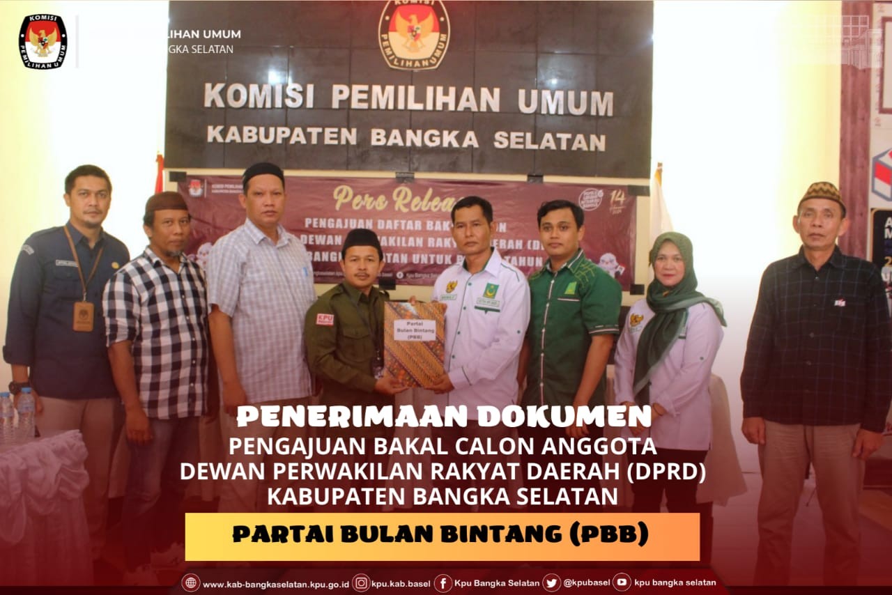 #TemanPemilih, KPU Kabupaten Bangka Selatan menerima kehadiran Partai Bulan Bintang (PBB) dalam rangka Pengajuan Bakal Calon Anggota Dewan Perwakilan Rakyat Daerah (DPRD) Kabupaten Bangka Selatan, Sabtu (13/05/2023).