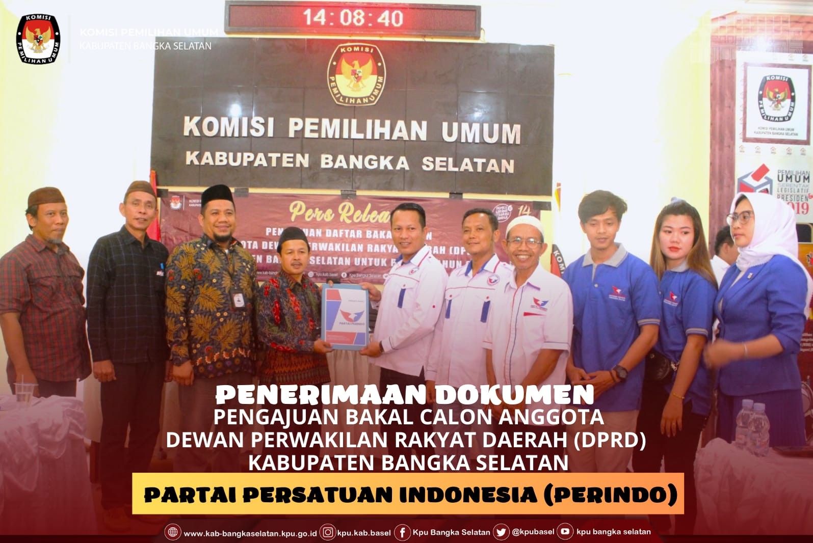 Anggota KPU Kabupaten Bangka Selatan serta Sekretaris KPU Kabupaten Bangka Selatan, secara simbolis menerima berkas pengajuan yang dilakukan oleh Pimpinan Partai Persatuan Indonesia (PERINDO) bersama Dewan Pimpinan partai lainnya.