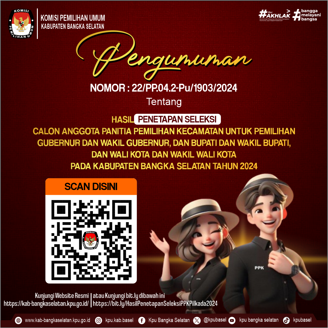 #TemanPemilih, berikut kami sampaikan Pengumuman Nomor: 22/PP.04.2-Pu/1903/2024 tentang Hasil Penetapan Seleksi Calon Anggota Panitia Pemilihan Kecamatan (PPK) untuk Pemilihan Gubernur dan Wakil Gubernur, Bupati dan Wakil Bupati, dan Walikota dan Wakil Walikota pada Kabupaten Bangka Selatan Tahun 2024.