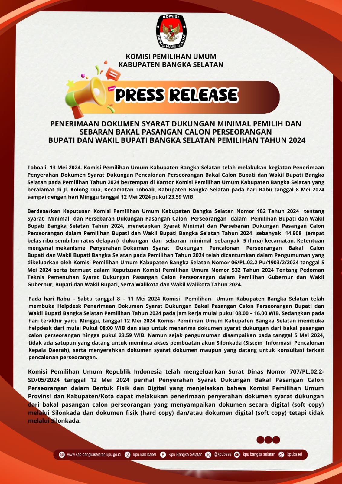 #TemanPemilih berikut kami umumkan Siaran Pers Penyerahan Dokumen Dukungan Bakal Pasangan Calon Perseorangan dalam Pemilihan Bupati dan Wakil Bupati Bangka Selatan Tahun 2024. Info selengkapnya Klik DISINI