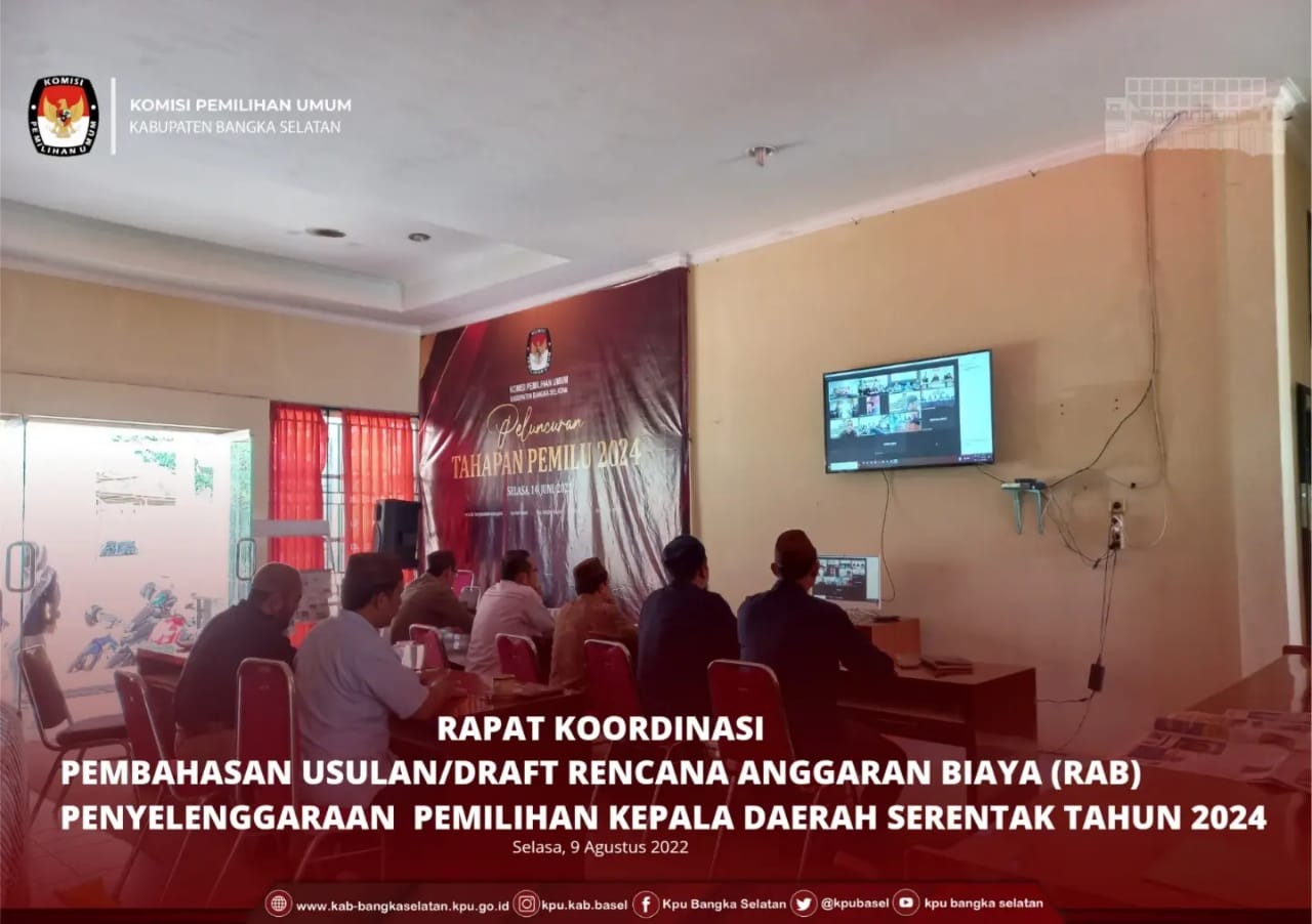 Toboali, kab-bangkaselatan.kpu.go.id-Komisi Pemilihan Umum, Senin 08 Agustus 2022, Komisi Pemilihan Umum Kabupaten Bangka Selatan mengikuti Rapat Koordinasi Pembahasan Usulan Rancangan Anggaran Biaya (RAB) Penyelenggaraan Pemilihan Gubernur dan Wakil Gubernur Kepulauan Bangka Belitung Tahun 2024 KPU se-Provinsi Kepulauan Bangka Belitung secara daring pada Selasa, 9 Agustus 2022 di ruang rapat KPU Kab.Bangka Selatan.