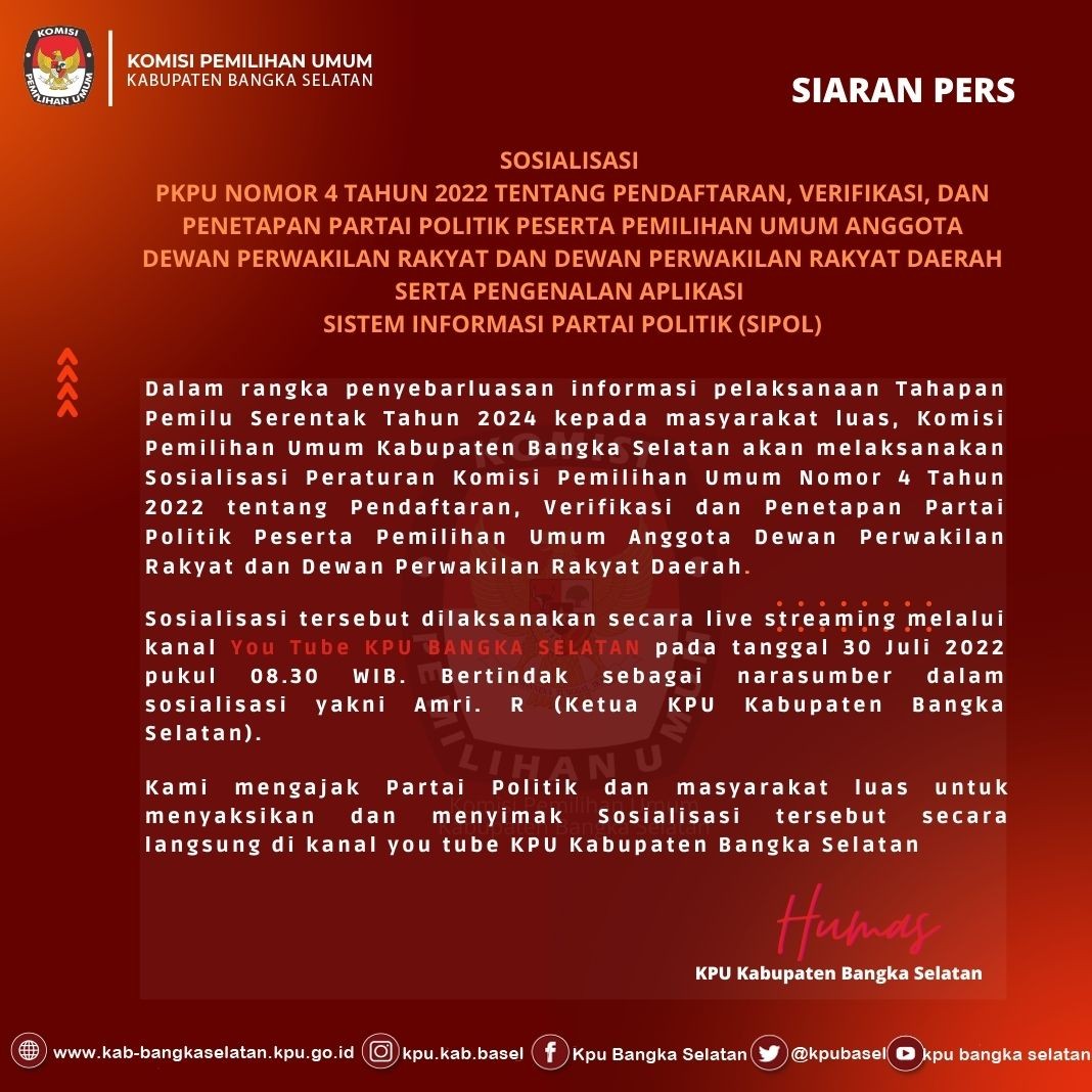 Toboali, kab-bangkaselatan.kpu.go.id - Sabtu, 30 Juli 2022, KPU Kabupaten Bangka Selatan menyelenggarakan Sosialisasi Peraturan KPU Nomor 4 Tahun 2022 bertempat dikantor KPU Kabupaten Bangka Selatan.