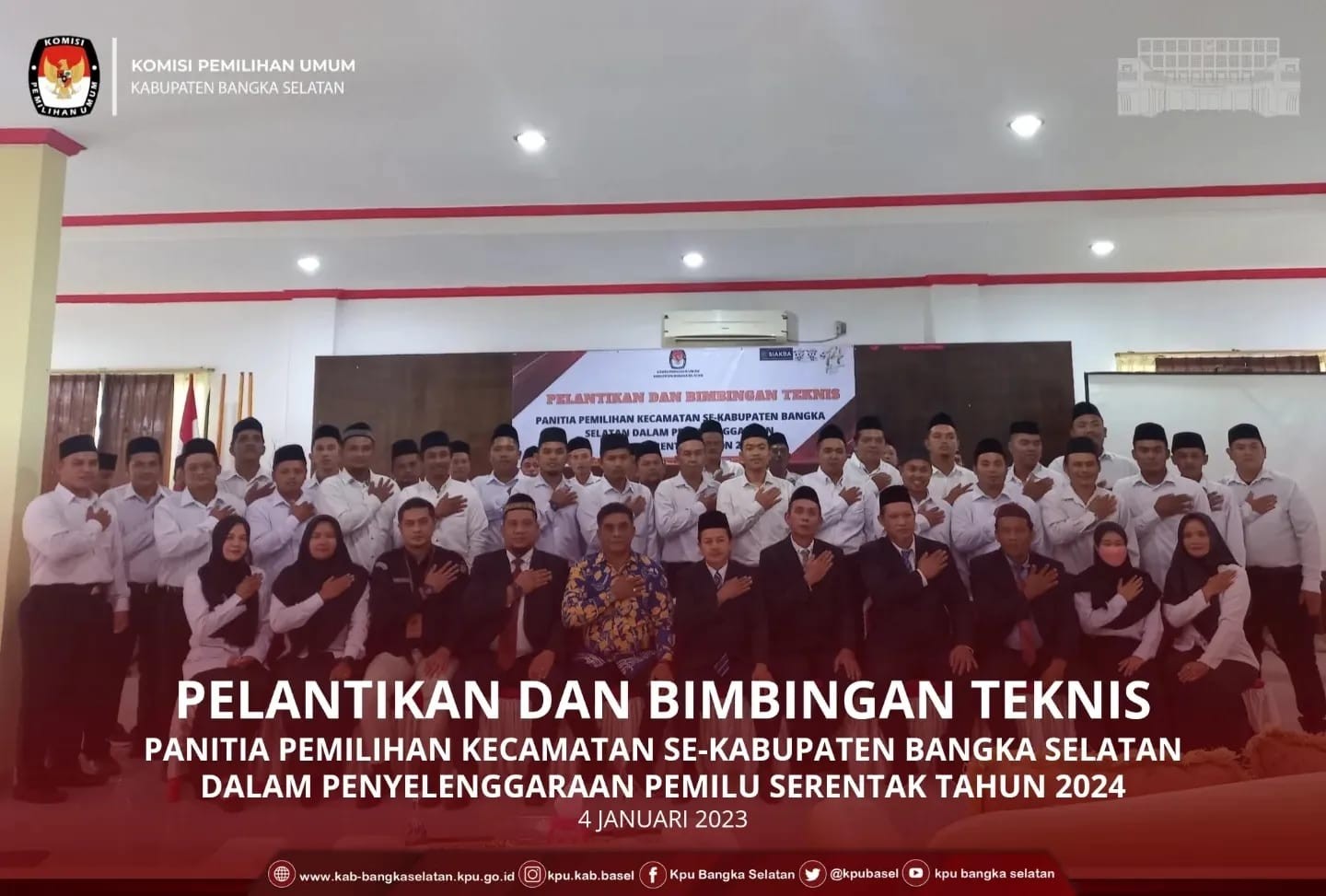 Pada kegiatan ini anggota PPK terpilih diambil sumpah/janji dan dilantik oleh Ketua KPU Kabupaten Bangka Selatan dan juga dilakukan pembacaan dan penandatanganan pakta integritas Anggota PPK se-Kabupaten Bangka Selatan pada Pemilu tahun 2024.